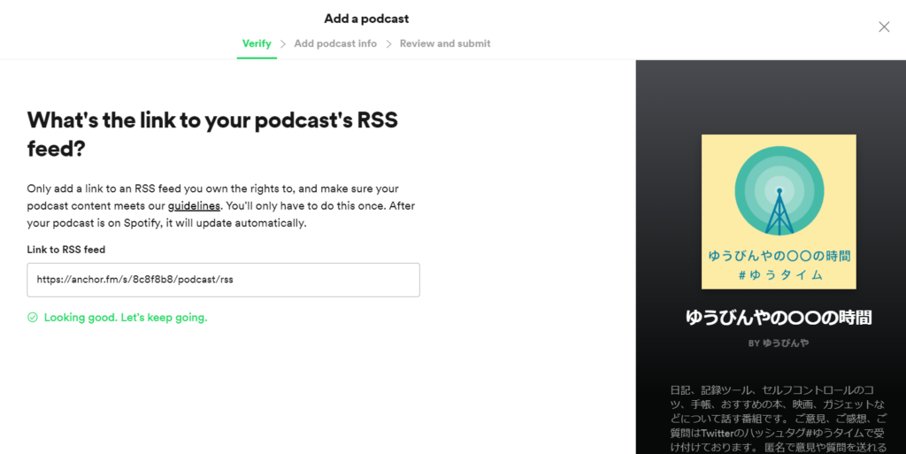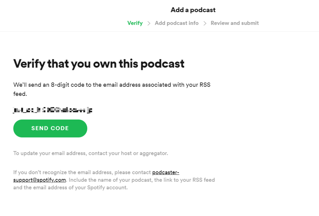 Anchorでポッドキャストを配信されている方は、 「Spotify for Podcasters」 へ登録する前にRSS feedに自分のメールアドレスを表示させる必要があります。