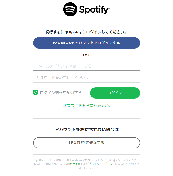 お持ちのSpotifyのアカウントでログインしましょう。Spotifyのアカウントを持っていない場合は登録が必要です。