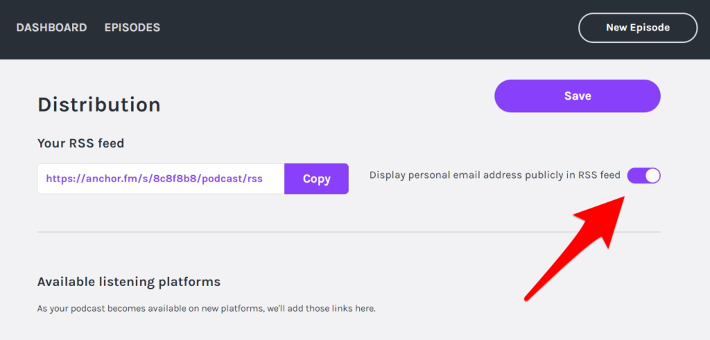 Anchorを使ってPodcastを配信されている場合は、アプリではなくAnchorのサイトからログインして、メニューの中の「Distribution」から下の画像の矢印の部分を紫にしてください。