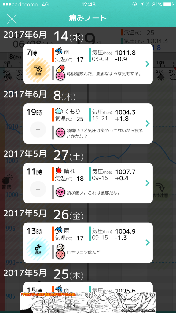 ↓こんな具合に気圧のグラフと自分がいつどんなふうに頭が痛かったか記録できます。
